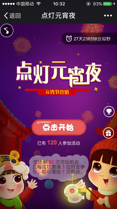 快速点击屏幕上的灯笼,可使其变亮;在规定时间内,点亮的灯笼越多,得分越高。