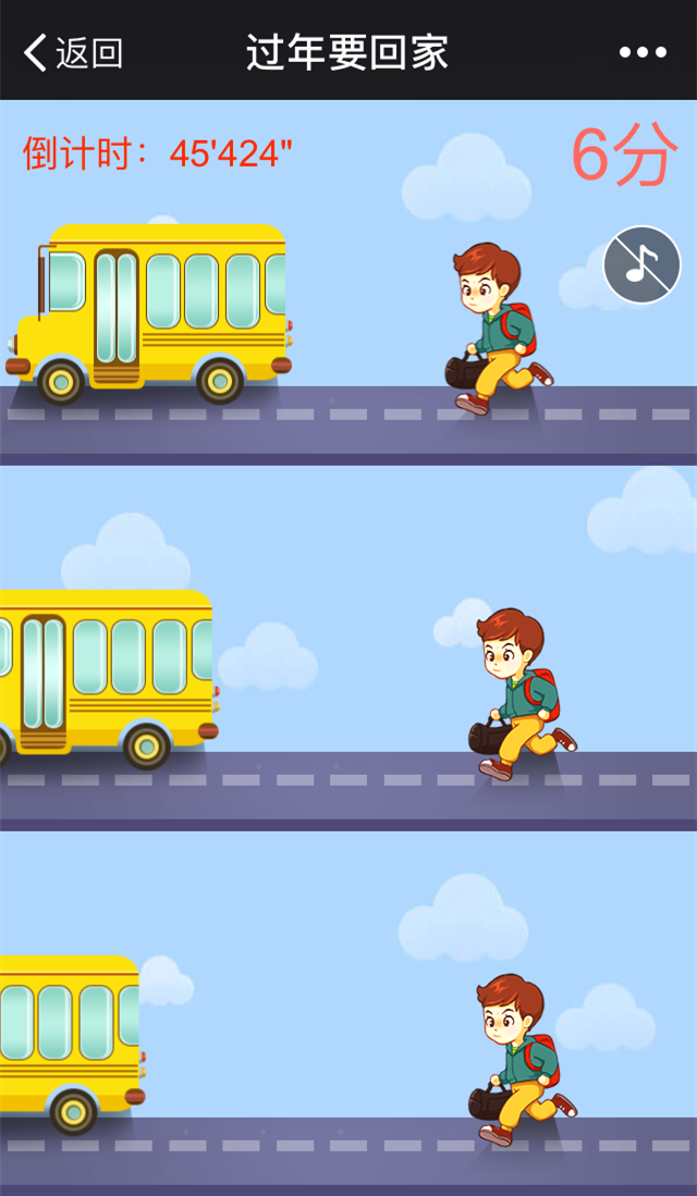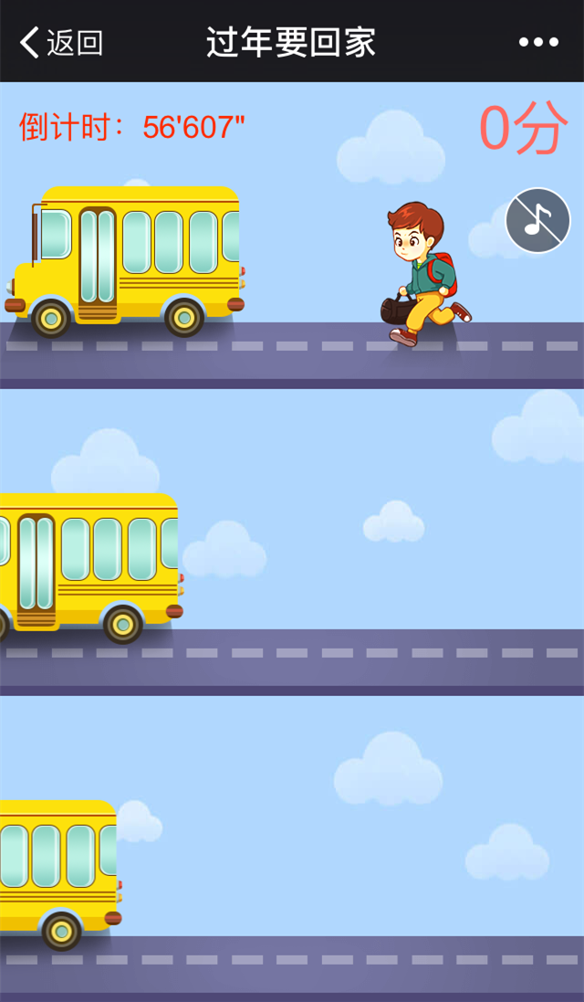 持续点击屏幕,让小男孩赶上回家的最后一班车。游戏过程中,注意防止任何一个男孩落后,否则游戏结束。