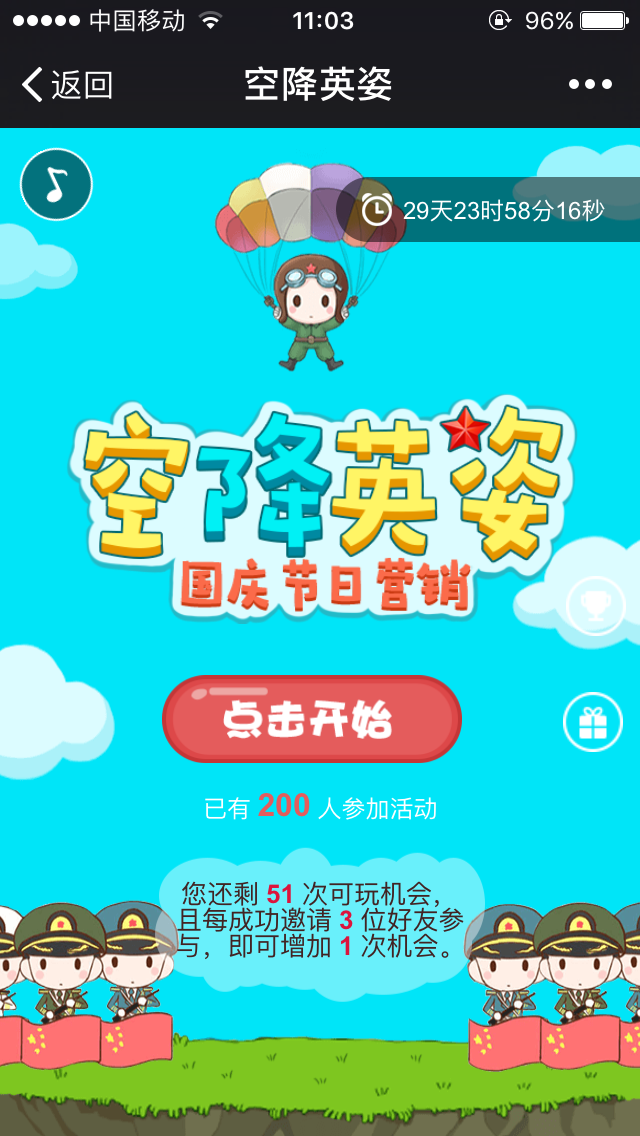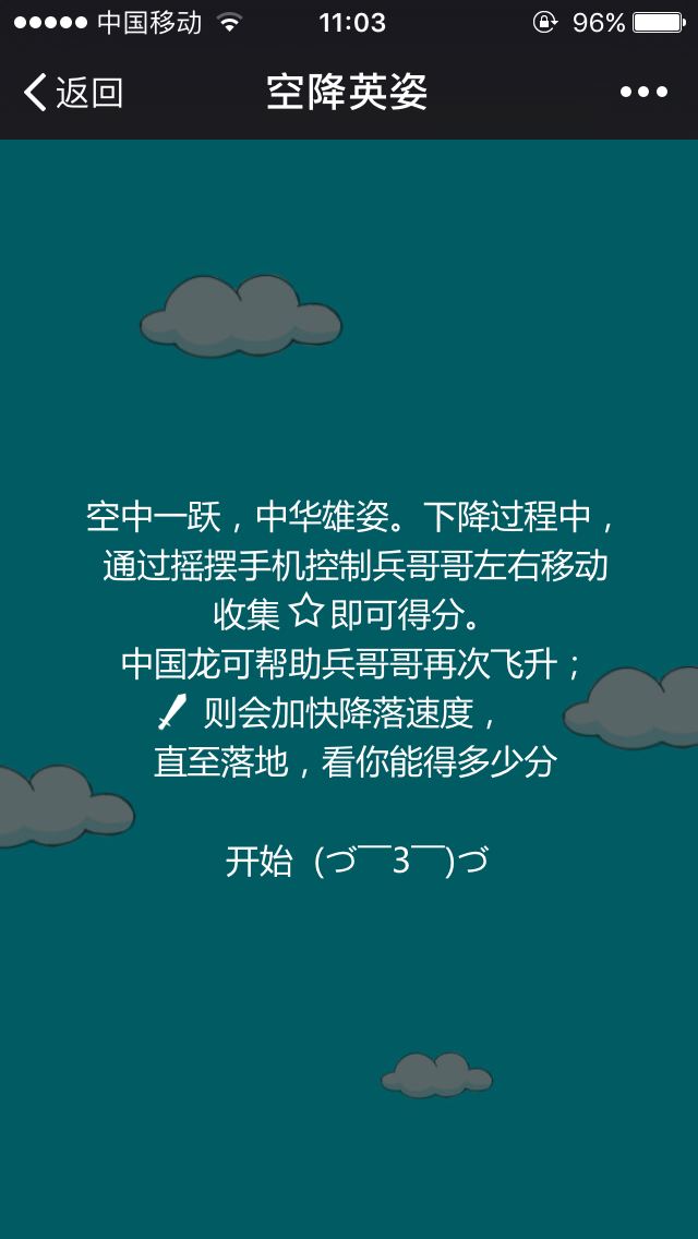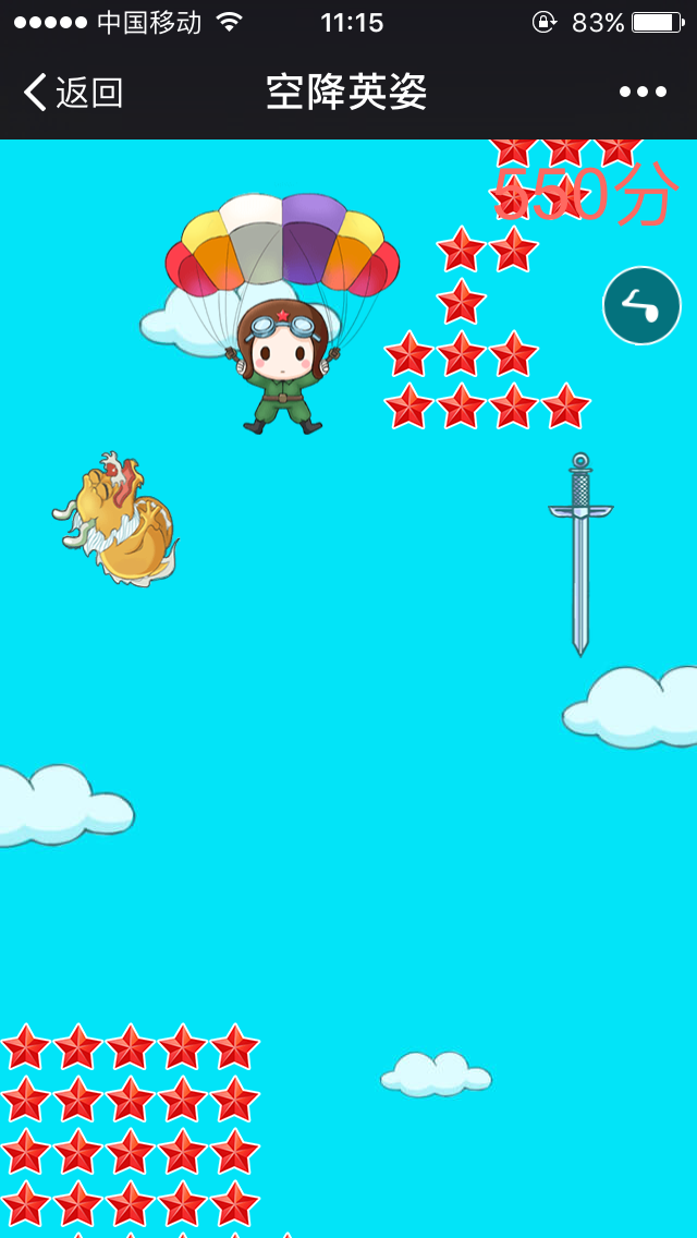 在人物下降过程中,通过摇摆手机控制人物移动方向。收集五角星可得分,触碰中国龙可帮助人物再次飞升;触碰王者之剑则会加快降落速度。在人物落地前,看看你能收集多少分。
