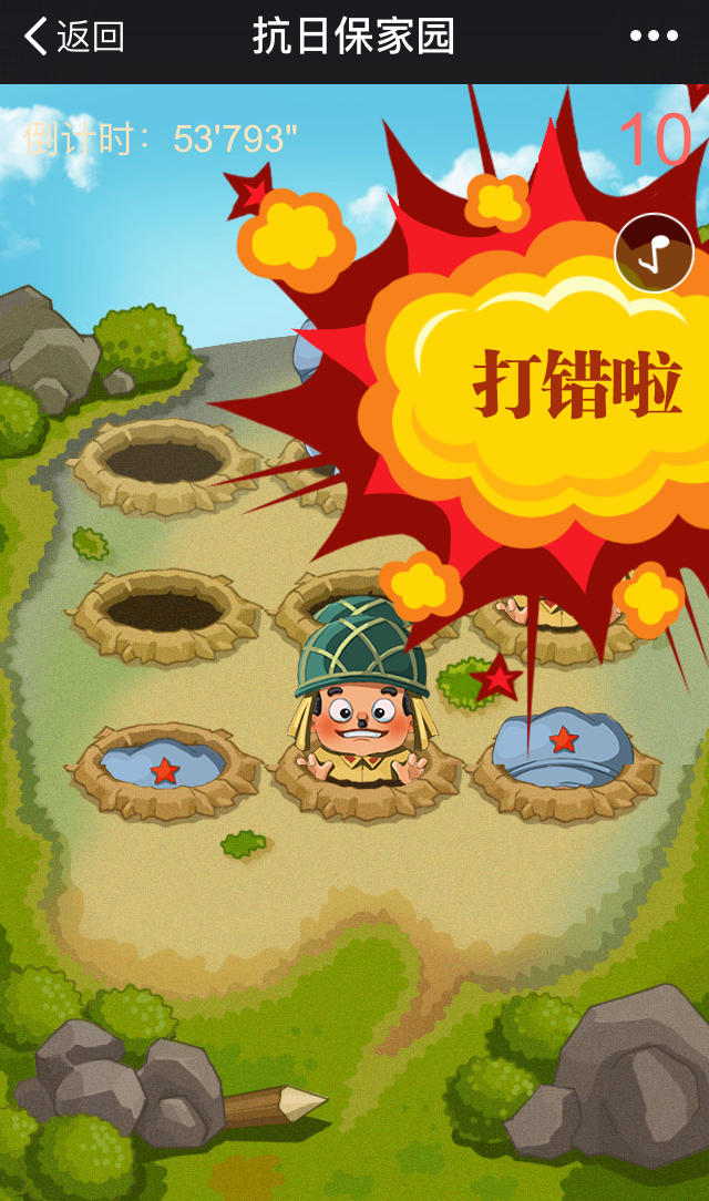 红军和鬼子从地洞中随机出现,打到鬼子可加分,注意避免误打到红军战士。得分越高,排名越高。
