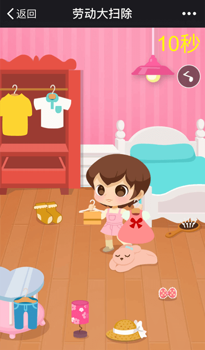 点击屏幕中的物品,将它们放回原位,比如衣服挂在衣柜里,垃圾扔在纸篓里等等。成功放回所有物品,用时越短,排名越高。