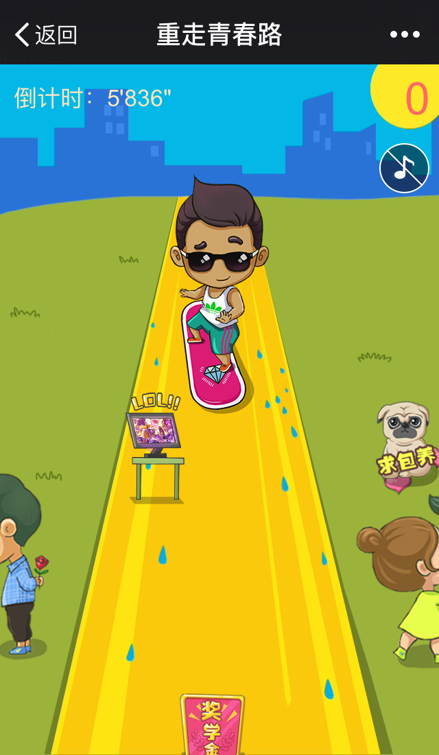 玩家点击屏幕控制滑板男孩的左右移动方向,以便get到可加分的物品(奖学金、足球、学生证等);同时注意避让减分物品(赖床、游戏)。