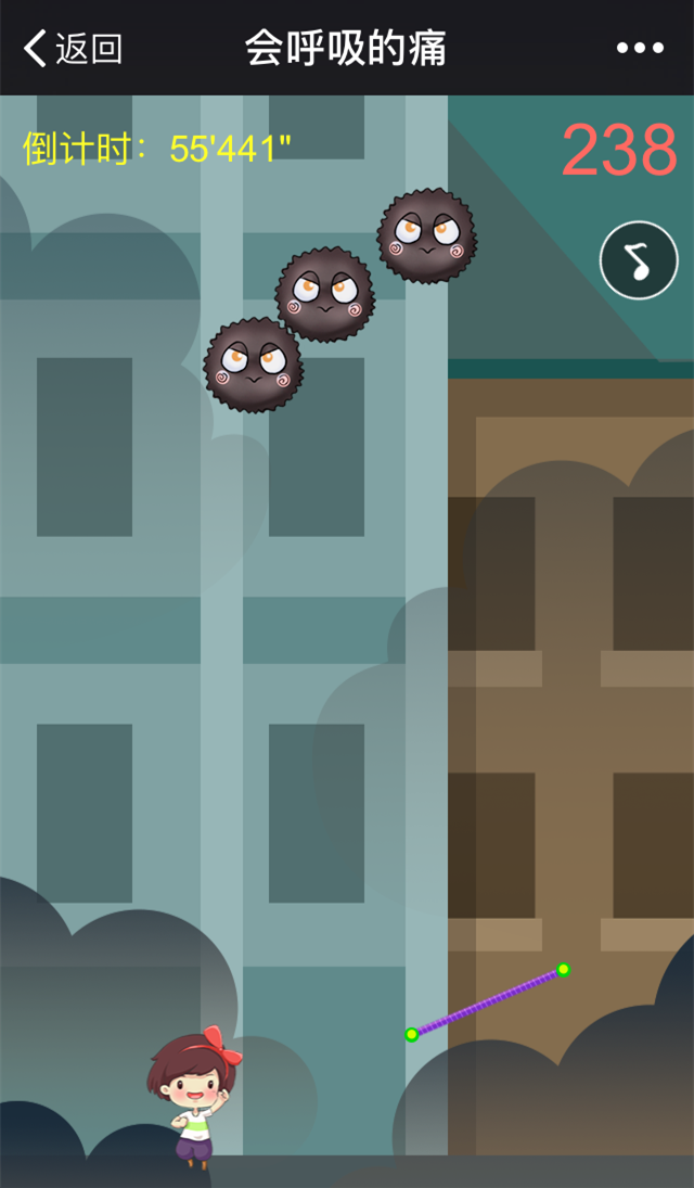 在屏幕上划出落脚杆,帮助游戏人物不断上跳躲避乌云和雾霾怪兽。上跳的距离越高,得分越高。人物跌落,则游戏结束。