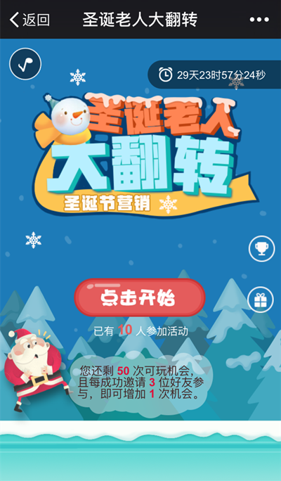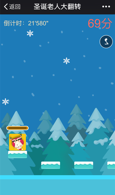 长按屏幕,可调整圣诞老人的能量条,控制翻转的距离,让其成功翻转到冰块上。落入间隙会导致游戏结束。在规定时间内,翻转的距离越远,得分越高。