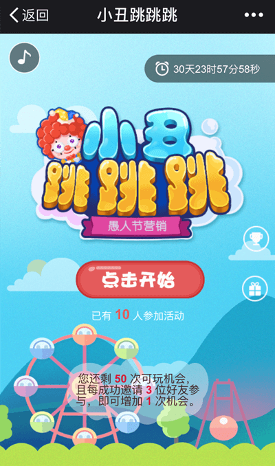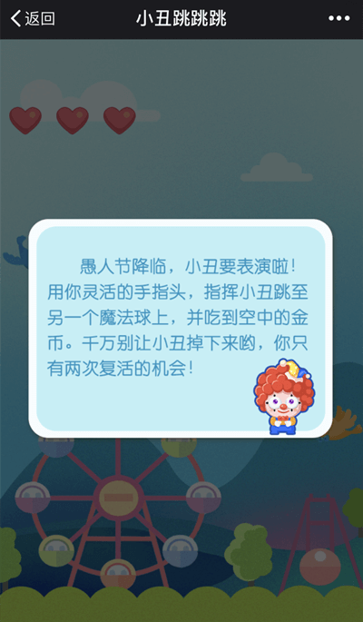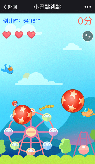 瞅准方向,点击屏幕让小丑成功跳至另一个魔法球上,并吃到空中的金币,可获得相应的分数;在规定时间内,得分越高,排名越高。小丑跳跃失败即失去一次生命,你一共有两次复活机会~~