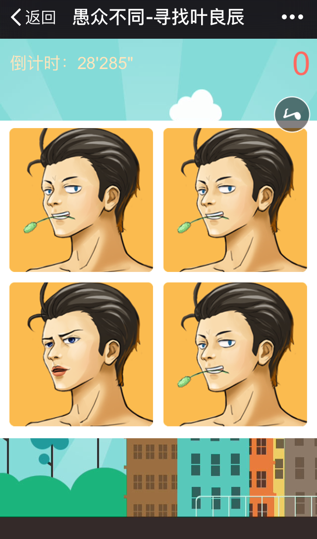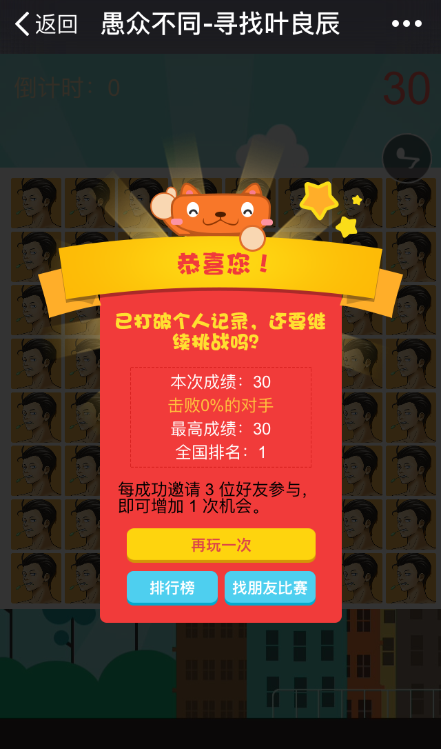 粉丝需要在给出的所有人物图片中,找出其中不同的一张。闯关越多,用时越短,排名越高。