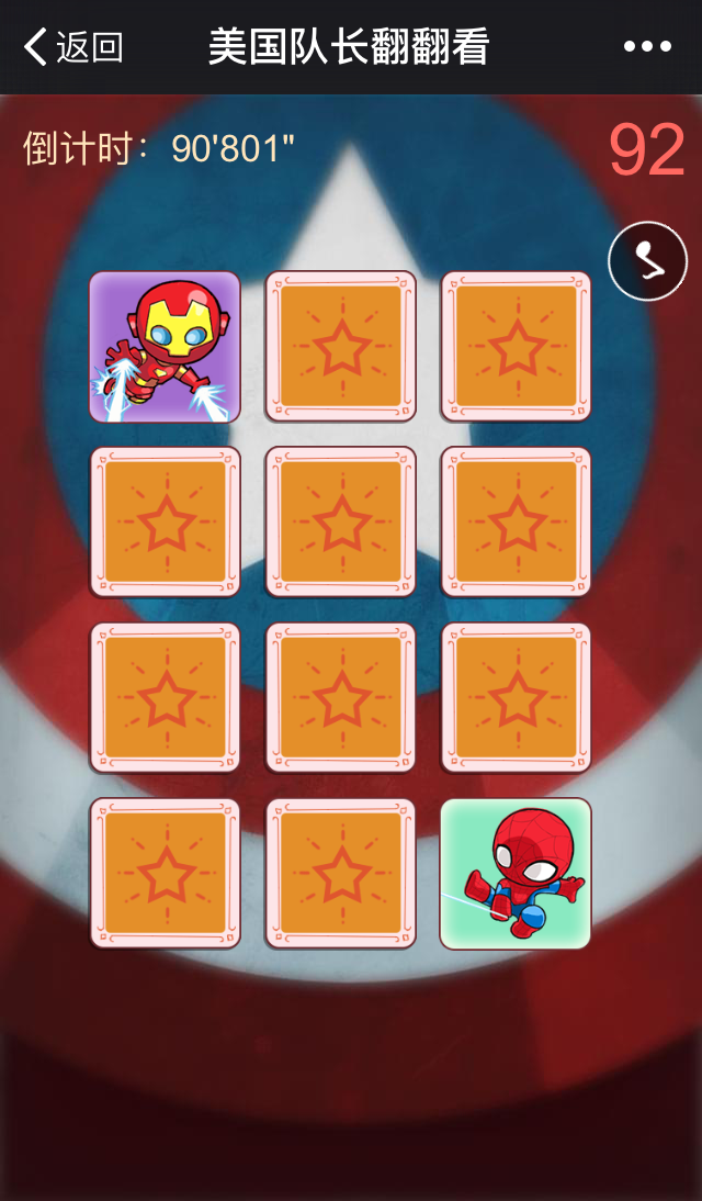 粉丝翻开英雄牌并记住人物,翻开两个相同的人物即可消除。用时最短,得分越高。