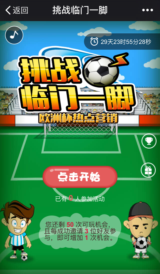 点击屏幕中的水平线与垂直线,选择合适的射门角度,同时注意避让守门员。在规定时间内,进球数越多,得分越高。