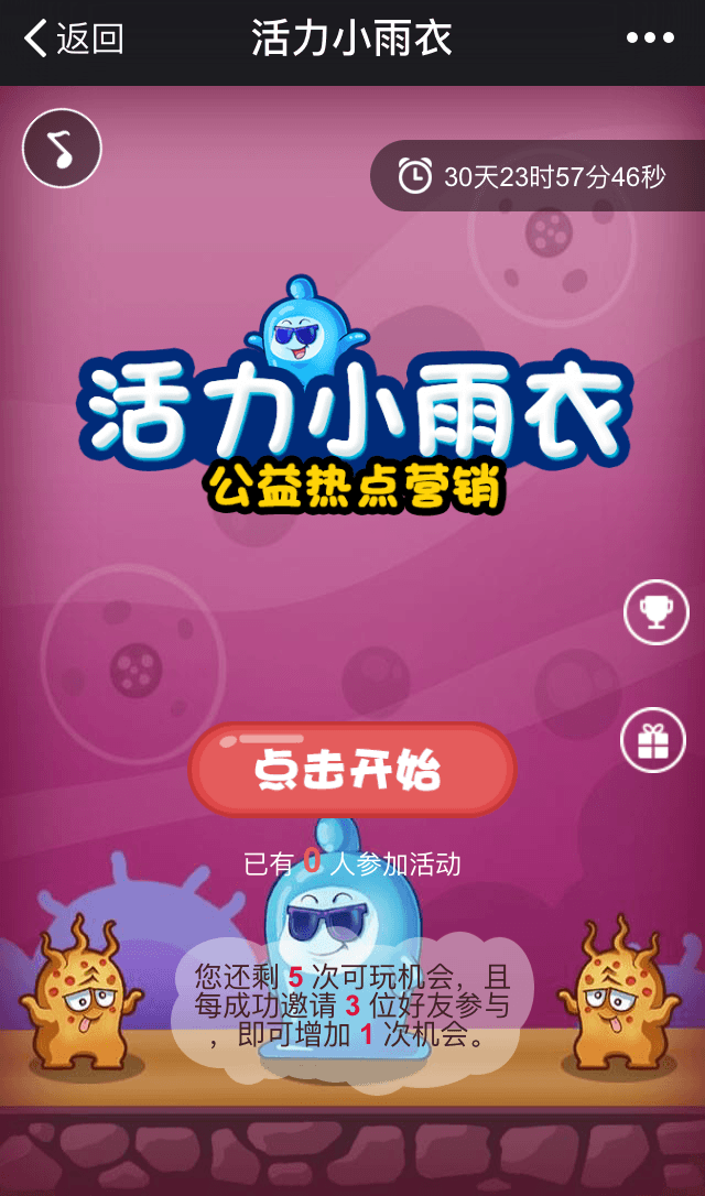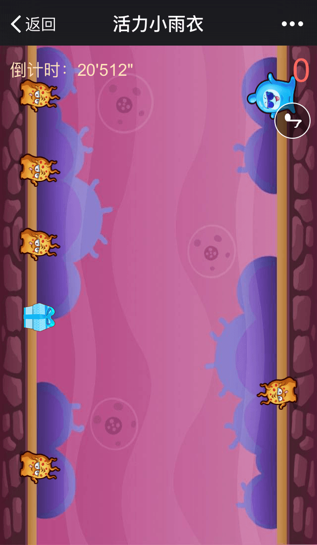 点击左右屏幕,让小雨衣跳至空白处,避免触到小病毒。在规定时间内,尽可能让小雨衣跳得更远;得分越高,排名越高。