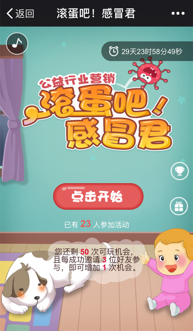 点击屏幕上的红色感冒君即可得分。点击的感冒君数量越多,得分越高。在规定时间内尽可能多拿分。