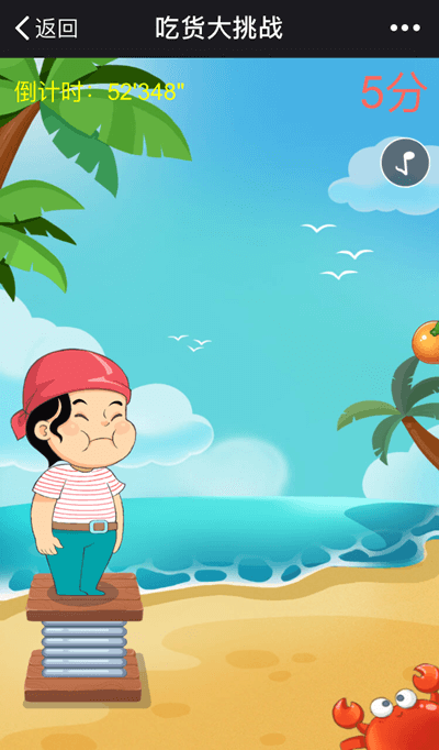 长按屏幕可控制人物的移动高度,让其成功吃到飞来的水果,可得分;错失即视为失败。在规定时间内,吃的水果越多,得分越高,排名越高。