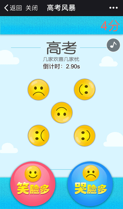 在每个关卡的倒计时内,判断屏幕中是笑脸图片多还是哭脸多,答对可得分,答错则游戏结束。