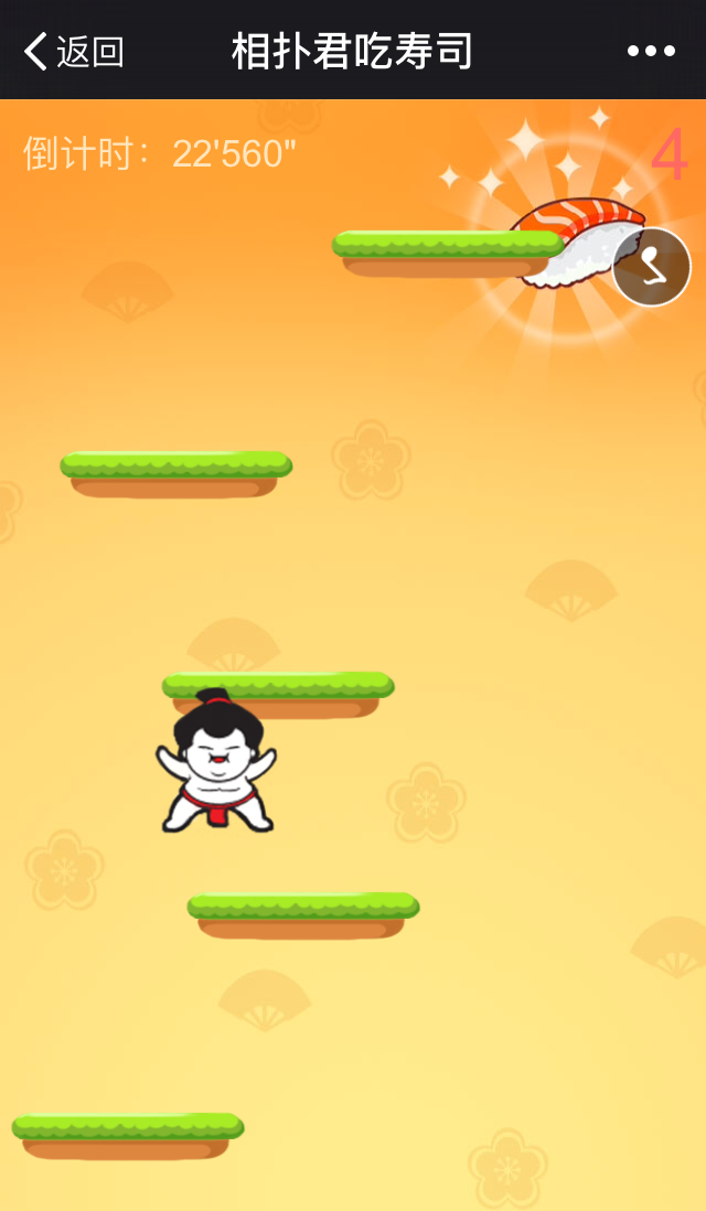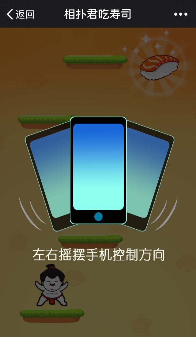 玩家需要左右倾斜手机,来控制相扑君的跳跃方向,让相扑君一级一级向上跃去,朝着美味的寿司奋进。在规定时间内,越接近寿司,得分越高。