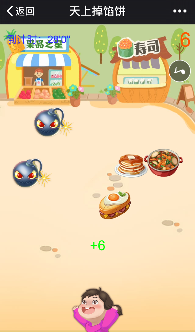玩家按住游戏人物左右滑动,以便吃到从天而降的美食;同时还须注意避让不断出现的炸弹。每吃到一份美食可加分,遇到炸弹会减分,得分越高,排名越高。