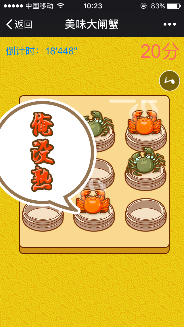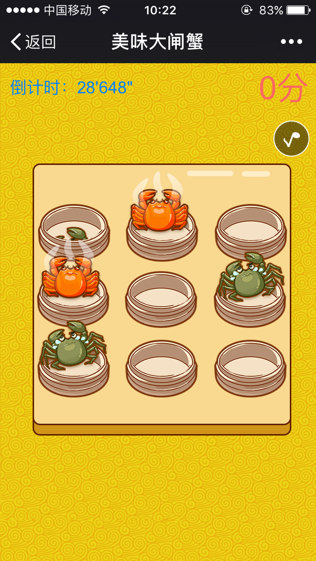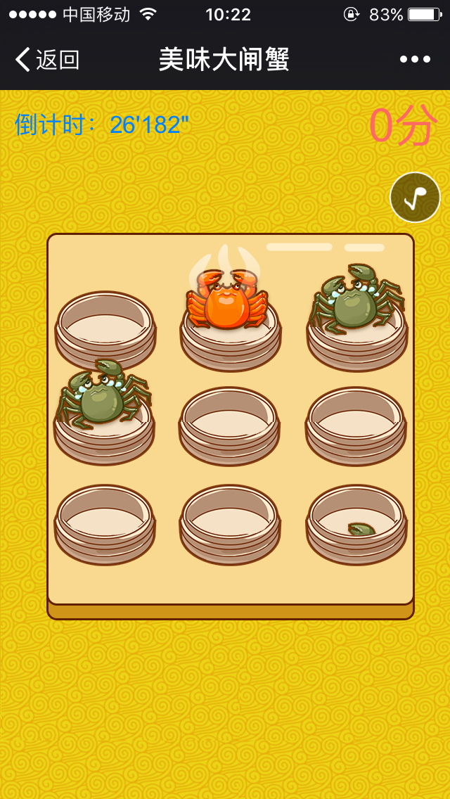 蒸锅中的大闸蟹随机出现,点击已熟透的大闸蟹可得分,得分越多,排名越高。