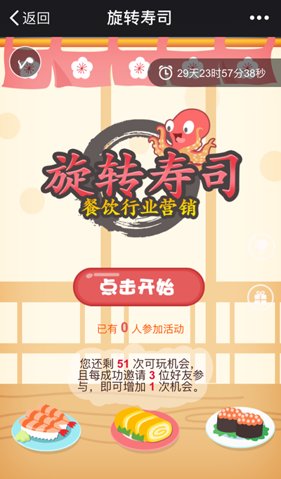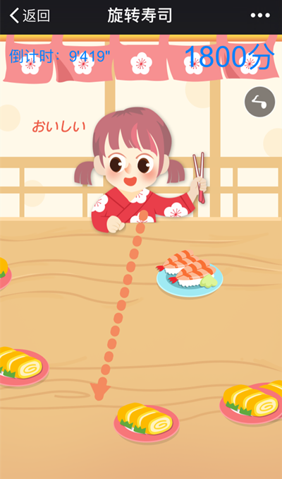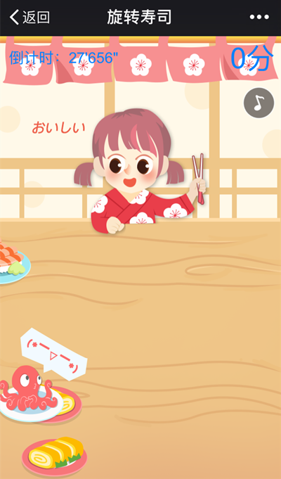 点击屏幕上移动的寿司,可加分;误点章鱼则减分。在规定时间内,点到的寿司越多,得分越高。