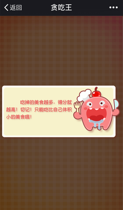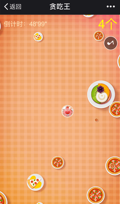 按住贪吃王左右移动吃掉比自己体积小的美食,可得分;吃的美食越多,贪吃王的身体会越大,得分越高。注意避让比贪吃王体积大的美食,否则会导致游戏结束。
