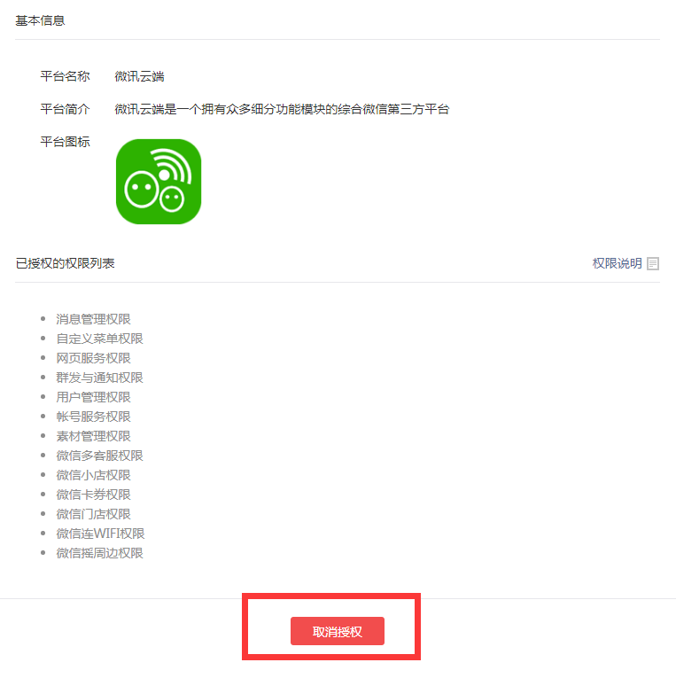 进入查看平台详情页面后,在底部就可以操作是否需要取消当前第三方平台的授权了。下图所示
