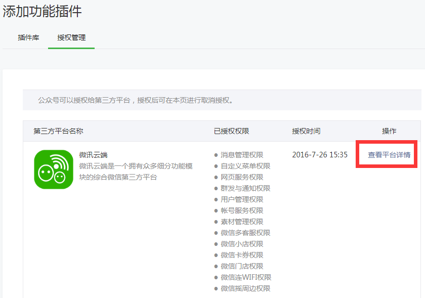 在操作中“查看平台详情”就可以看到这个第三方平台的具体信息了。下图所示