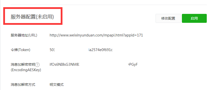 查看到服务器配置项目,启用表示已通过手动绑定公众号,未启用表示没有手动绑定公众号。“启用”或“停用”就分别来控制公众号的绑定状态了。下图所示