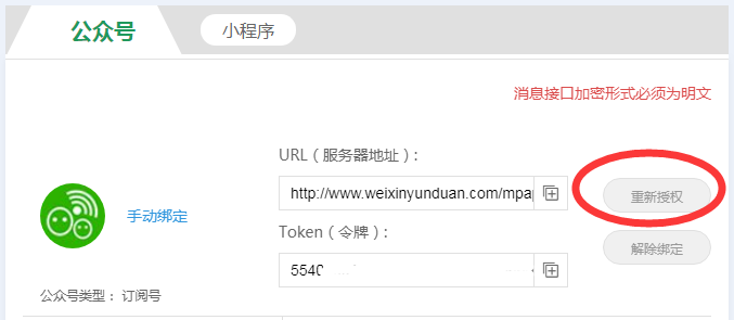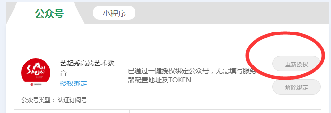 进入到后台微讯主页之后,在选项卡中选择公众号,然后在页面右侧有一个“重新授权”,点击这个按钮就可以重新绑定公众号了,公众号之前无论是手动绑定的还是授权绑定,这个一键解除按位位置都在同一个地方。