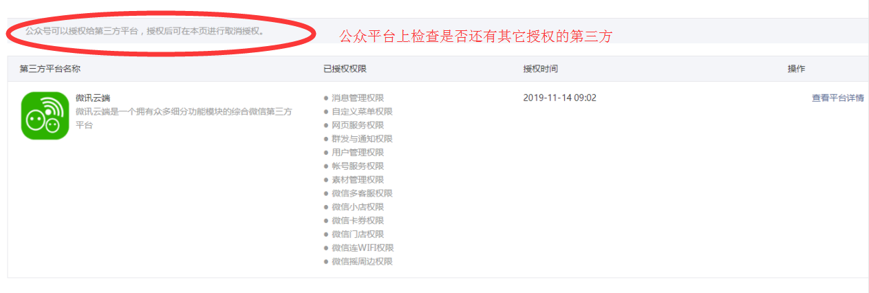 二、确认公众号已经完成一键授权绑定后,还有如上提示的话,请需要到公众平台查看授权的其它平台了。