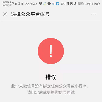 此个人微信号没有绑定任何的公众号或小程序,请绑定后或更换微信号再试”。如下图