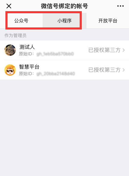 3、选择公众号或者小程序标签页,查看当前个人微信号是哪些公众号或小程序的管理员。如下图