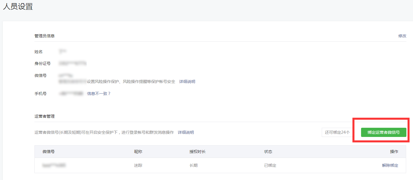 一、公众号运营人员添加,请进入公众平台---设置---人员设置---运营者管理---绑定运营者微信号。如下图
