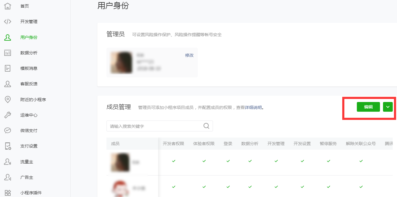 二、小程序运营人员添加,请进入公众平台---用户身份---编辑---绑定运营者微信号。如下图