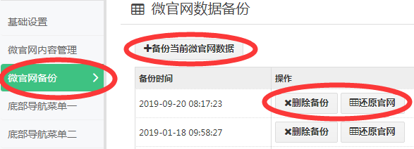 温馨提示:微官网有备份功能,请在编辑前记得备份一下,以防丢失,备份的内容支持一键还原噢。