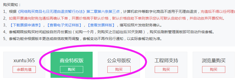 看一下上面的截图流程,那您肯定是知道这个套餐是可以去哪里购买,怎么购买了,反正是商业特权版还是公众号版权这两种套餐,买哪一种都可以,小伙伴们看清楚套餐内容之后,然后提交订单就可以了,如果当前账号里没有余额的话,那系统会在提交订单的时候会自动跳转到充值页面。