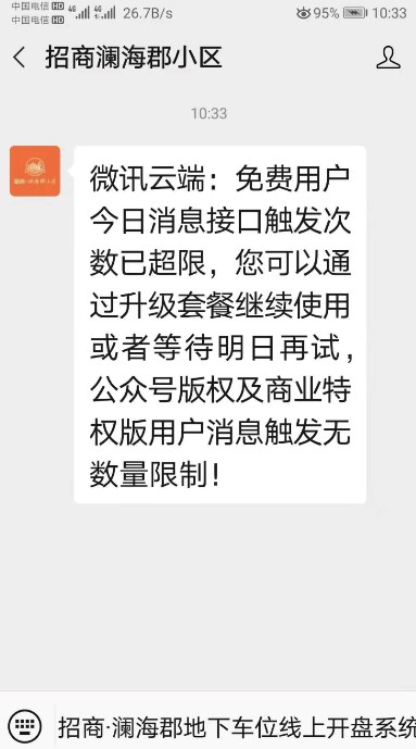 免费用户今日消息接口触发次数已超限.............”这样的说明,如下图所示: