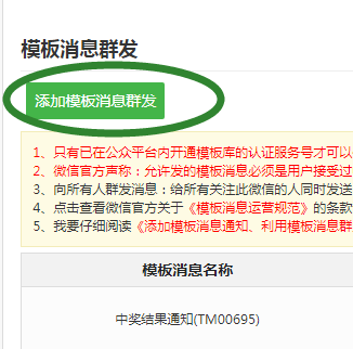 先在模板消息群发页面上,点击添加模板消息群发这个按钮,进入到模板消息群发的创建页面里。