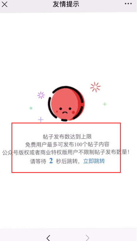 小编现在了解到有些小伙伴们在使用微社区功能的时候,在微信端进行发帖时,系统会有提示“帖子发布数达到上限”的通知,这个提示它所告知的意思很明确了,就是在微社区功能内发的帖子数量较多,达到免费普通用户权限所发的帖子数量了。
