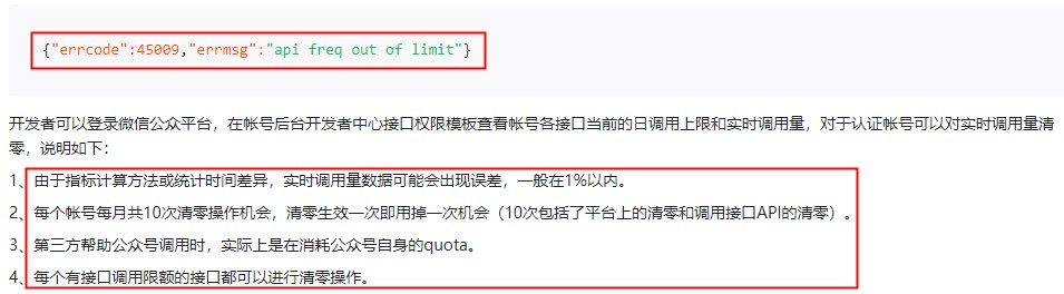 实际上公众号调用接口并不是无限制的。为了防止公众号的程序错误而引发微信服务器负载异常,默认情况下,每个公众号调用接口都不能超过一定限制,当超过一定限制时,调用对应接口会收到如上错误返回码了。