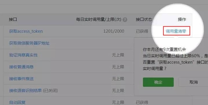 在操作一列出现“调用量清零”,开发者也就是公众号管理员可根据自身需要决定是否清零。