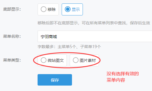 那问题是出在什么地方呢?其实也很简单,只要去逐个检查一下菜单中的内容有没有真实添加或选择就可以了,例如上图中的三个主菜单,其中一个主菜单是没有添加好内容的。如下图。