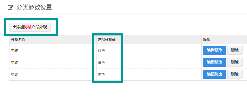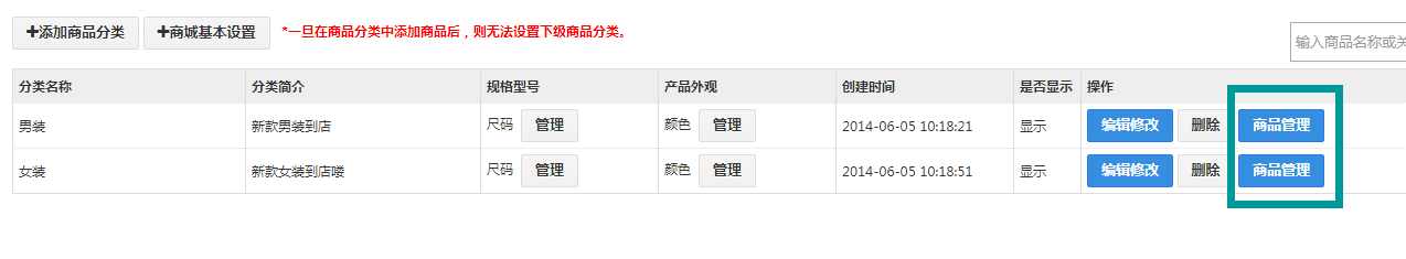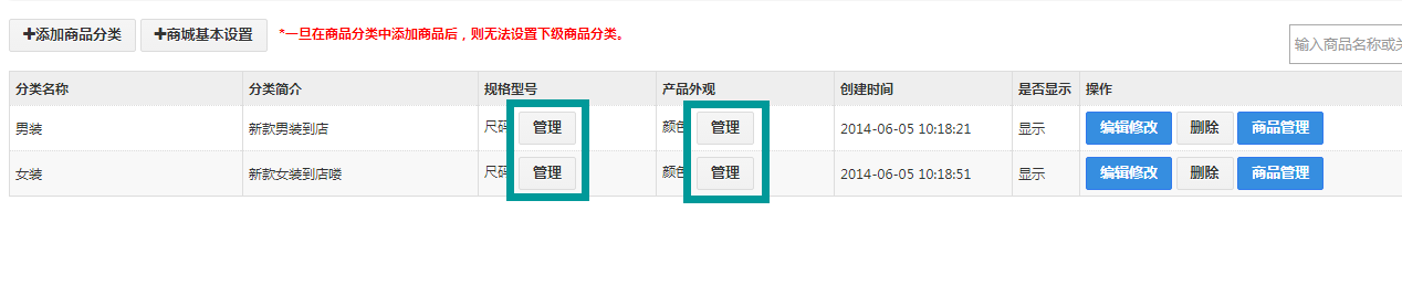 第三步、添加好分类后,就可以看到刚刚添加好的商品规格和外观这两项属性,同时分别点击这两项的“管理”按钮,分别给
