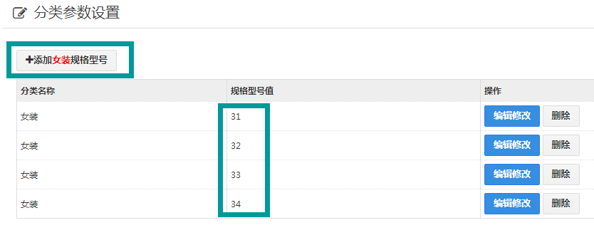 第四步、点击规格型号和产品外观中的《管理》按钮,然后进入子项后,直接点击《添加》按钮添加参数、比如当前商品的尺寸大小、外观颜色等,具体设置的参数以商品实际属性为准,如下图;