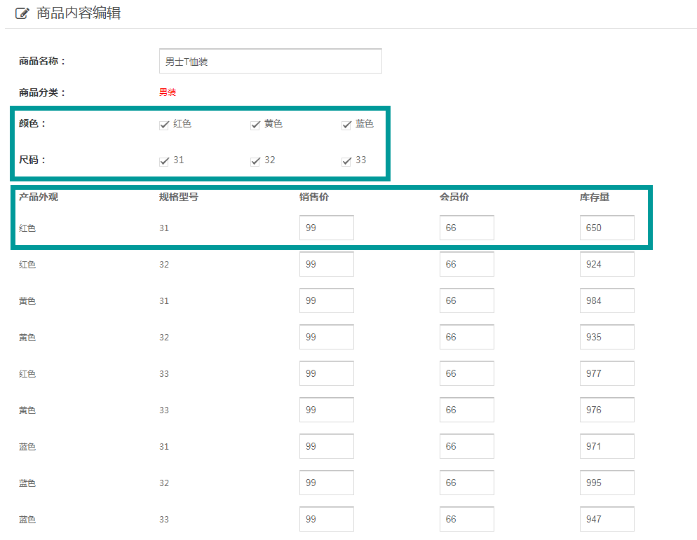对每一项商品规格进行单独的销售价格和库存数量的设置,如下图;