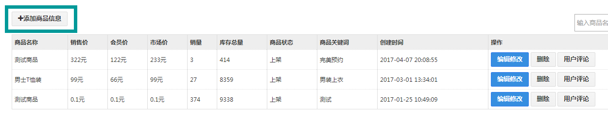 第五步、当添加好属性值后,返回到商品分类列表页,点击《商品管理》按钮,直接进入添加具体商品的页面,如下图;