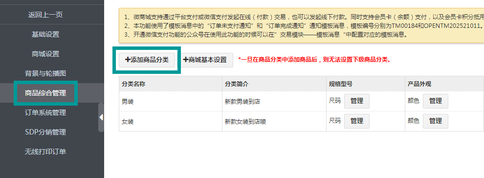 微商城功能后,首先在左侧栏目找到《商城综合管理》子项,然后点击右则《添加商品分类》按钮,如下图;