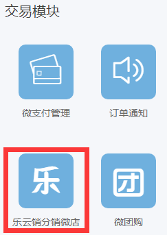 1、登录账号进入管理面板,点击功能模块图标按钮,在交易模块中找到乐云销功能。(下图)