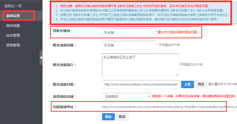 2、进入到乐云销功能后,在基础设置中完善此功能的基础信息。包括回复关键词、选择店铺、功能链接地址等。(下图)