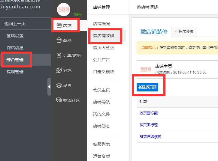1、左侧导航栏中选择综合管理,然后在下级导航栏中选择店铺,再下下级导航中选择微店铺装修,最后点击新建微页面按钮。(下图)