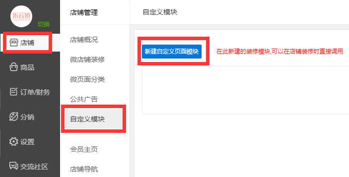 4、选择自定义模块,再点击新建自定义页面模块,在弹出的页面中可以自定义编辑,此自定义页面可以作为店铺装修页面调用。(下图)