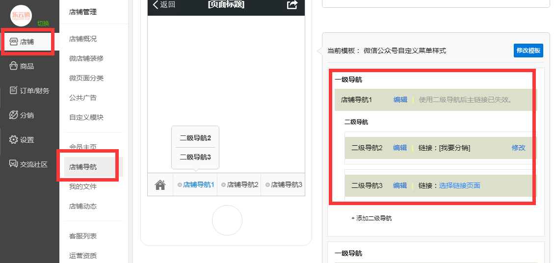 5、选择店铺导航,在页面右侧可以对导航按钮进入编辑,导航按钮最多支持二级,手机端进入店铺后此按钮通常在页面底部显示。(下图)