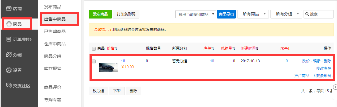 2、选择出售中的商品,可以查看到当前正在销售中的商品列表,可以对商品进行改价、编辑、修改库存等等。此商品栏目下,还可以对已售罄商品、仓库中商品、库存报警、商品评价、一键导入商品进行管理。具体方法详细每个栏目页面上的相关说明。(下图)