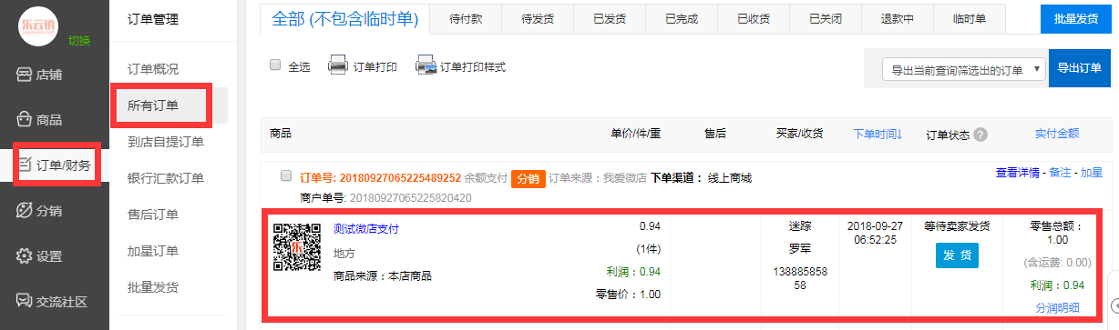 1、左侧导航栏选择订单/财务按钮,在下级导航栏中可以选择订单概况,也可以选择所有订单,可以查看到当前订单的详细信息,可以对订单进行发货处理等。(如图)